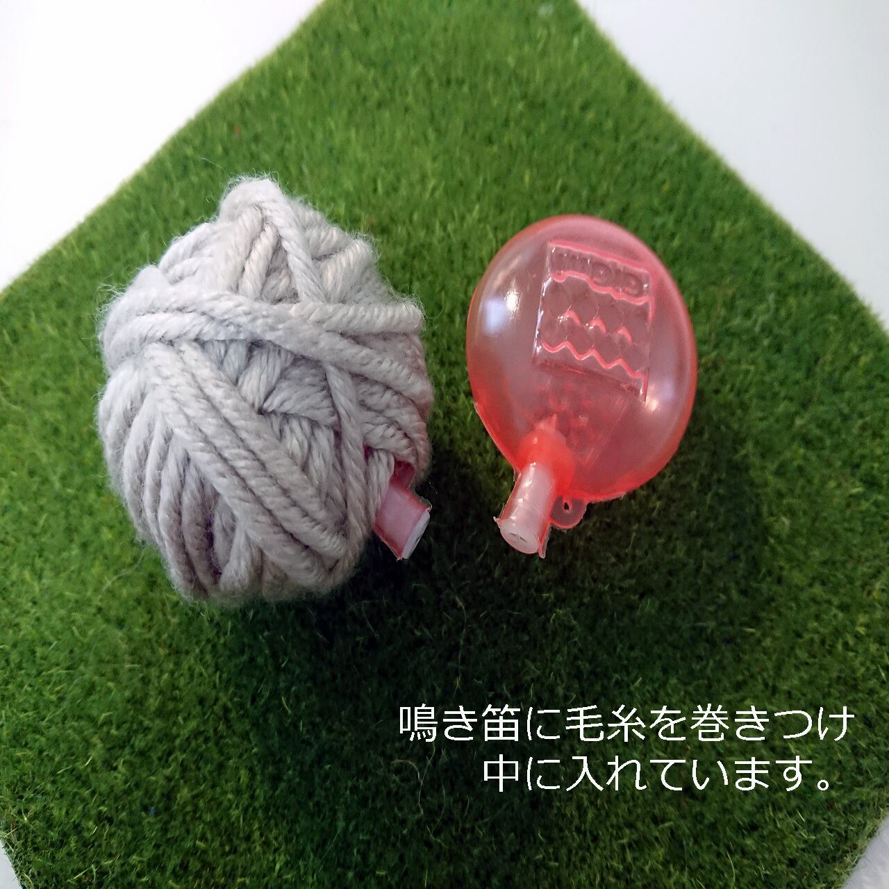 ・鳴き笛に巻きつけている毛糸には、接着剤等を使っておりません。噛んで遊んでいるうちに毛糸が外れることがございます。あらかじめご了承ください。